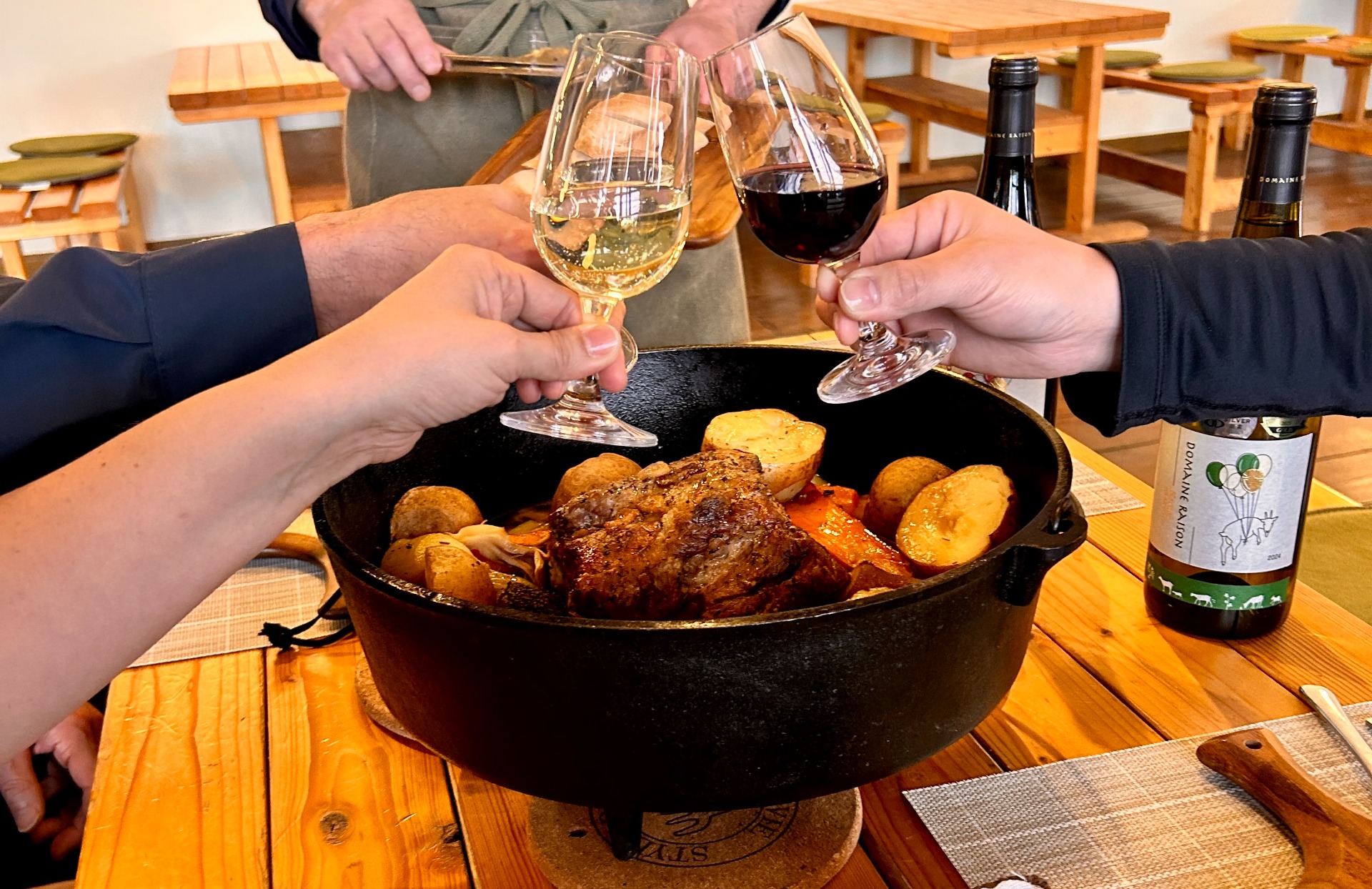 タベラサル・フラノに、看板メニューが登場しました。ダッチオーブンでじっくり火を入れた、北海道産ポークと地元・季節の野菜をたっぷり味わえるローストポーク&野菜です。肉の旨みを閉じ込める低温調理と、野菜本来の甘さを引き出すローストで、ダッチオーブンでお出しします。